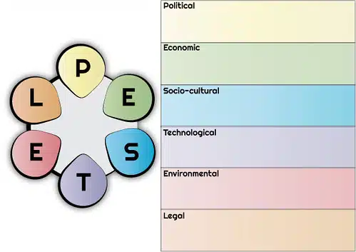 L’analyse PESTEL, en termes simples, est un outil qui aide une entreprise à identifier tous les éléments pouvant impacter son activité et son développement. Cet outil dispose de 6 différents composants. Il s’agit de : P comme Politique, E comme Économique, S comme Sociologique, T comme technologique, E comme Environnemental et L comme Légal.